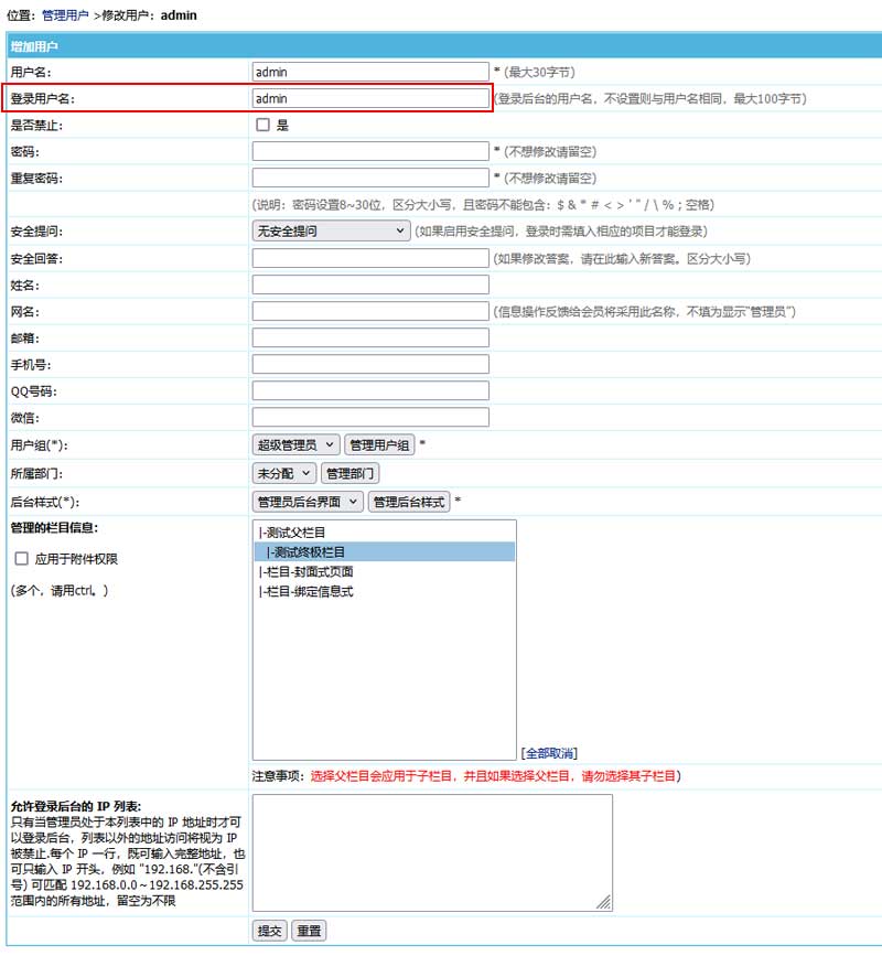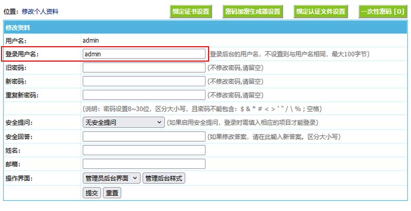 后台登录支持自定义登录用户名,可以与用户名不同,最长支持100个字符,更安全。设置有以下两个位置: