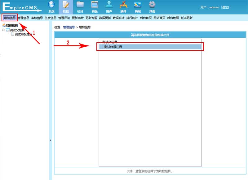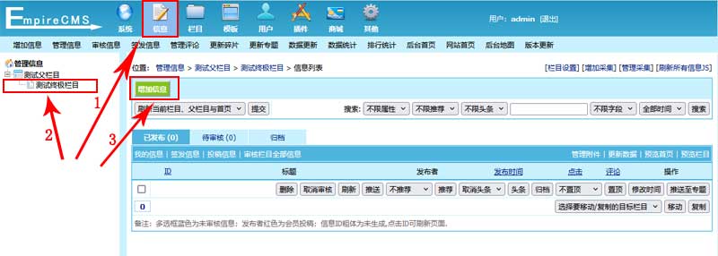 (增加信息前要先增加栏目,新手可以先看增加栏目教程)