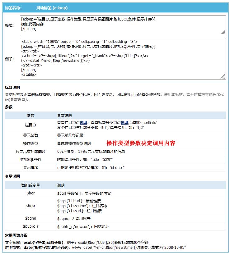 (第3个“操作类型”参数决定调用内容、以及决定第1个“栏目ID”参数内容。)
